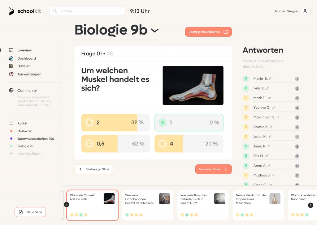 Mit schoolkit wirfst Du Deine Unterrichtsplanung ganz einfach an die Tafel wie eine Powerpoint. Nur, dass es keine statischen Folien sind, sondern jeder Schüler über sein Smartphone oder ein Tablet mitmacht und deine Materialien bearbeitet. Live und unkompliziert.